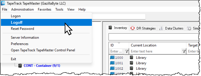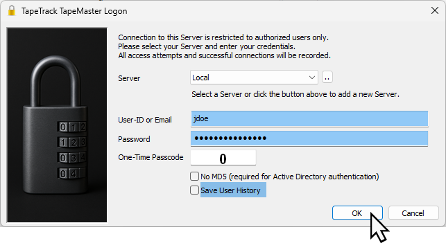 Log back into TapeMaster, noting the autofill list has now been removed and the Save user history has automatically been checked so future login usernames will be recalled as usual.