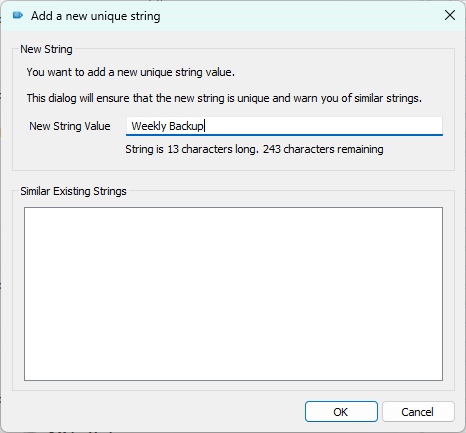 window displays any similar strings that may have already been entered, eg if you are adding weekly and someone has already added Weekly, this will be displayed. This function helps avoid adding similar strings that should be only one value.