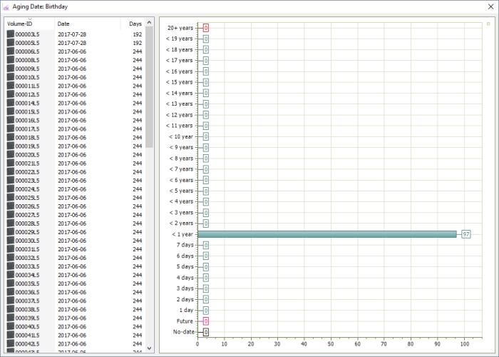 Displays a table and bar graph of selected volumes birthday or creation date.