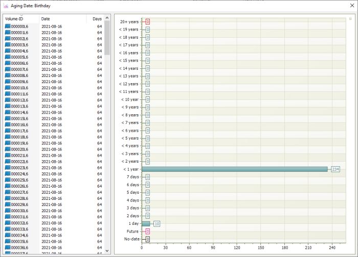 Volumes and associated information can be reordered by Volume-ID, Date or Days since last read by clicking on column headings. Clicking on the same heading will change the displayed order between ascending and descending order.