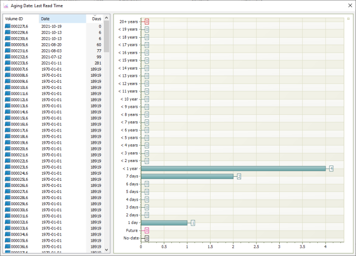 Displays a table and bar graph of selected Volumes last read date and time.