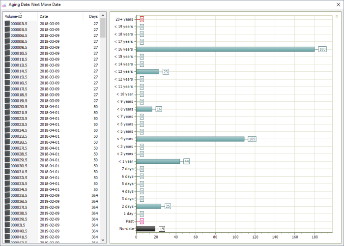 Volumes and associated information can be reordered by Volume-ID, Date or Days until next move by clicking on column headings. Clicking on the same heading will change the displayed order between ascending and descending order.