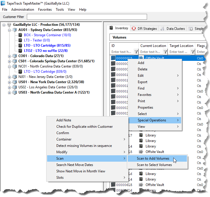 Right-Click in the Volume List, navigate to Special Operations, and select “Scan to Add Volumes” to use a Barcode scanner to add Volumes.