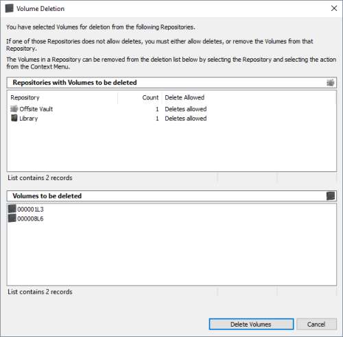 Each row in the top pane will, along with the Repository Description (or ID), list the number of Volumes for deletion and the delete status of either Deletes Allowed or Deletes Forbidden.