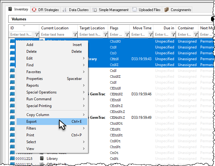 Using the Volume Global View function has an added advantage of being able to dynamically filter the data using Customer-ID, Media-ID, Volume-ID, Location, Flags, Move Dates, last User interaction and last Program Interaction before exporting results to a report.