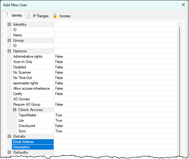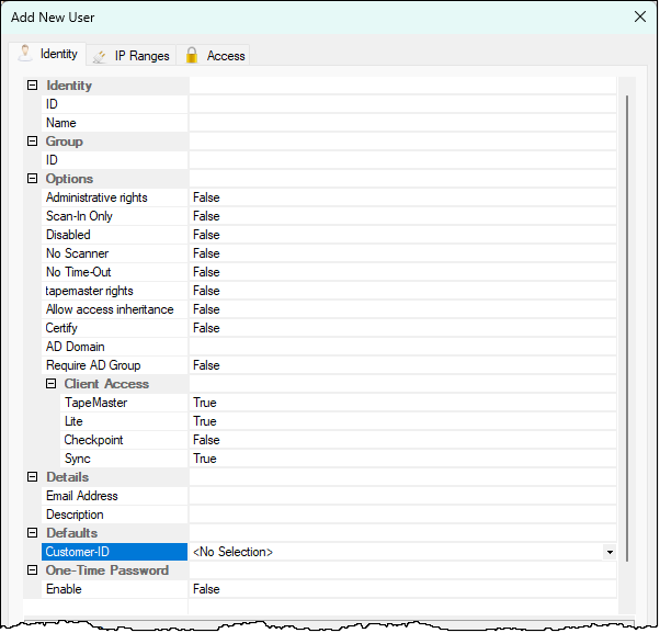 Client Access rights determine which desktop software the user-ID has access to. The access rights are for TapeMaster, Lite, Checkpoint and Sync.